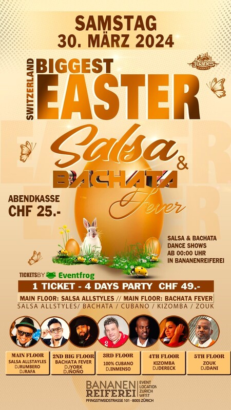 ❀ BIGGEST EASTER SALSA & BACHATA FEVER PARTY OF SWITZERLAND in BANANENREIFEREI❀ ❀ 1 TICKET 4 TAGE PARTY ❀ SA 30. - SO 31. - MÄRZ 2024 PROGRAMM BANANENREIFEREI ❀❀❀❀❀❀❀❀❀❀❀❀❀❀❀❀ ❀ PRGRAMM SAMSTAG 30. MÄRZ 2024 ❀ MAIN FLOOR 1: SALSA ALLSTYLES (368m² Dance Floor) ❀ MAIN FLOOR 2: BACHATA FEVER (400m² Dance Floor) ❀ 5 DANCE FLOORS ❀ Doors 21:30 bis 04:00 Uhr ❀ Abendkasse CHF 25.- inkl. Garderobe ••••• ❀ BACHATA WORKSHOP BY LISA & YORK • 19:30 bis 20:30h Bachata Ladystiling, Intermediate Advance by Lisa • 20:30 bis 21:30h Bachata Fusión, Intermediate Advance by York & Lisa • Sie brauchen nicht zu buchen, kommen Sie direkt zum Bananenreiferei am Samstag 30. März um 19:00 Uhr. Der Workshop Preis ist CHF 30.- für 2 WS Inkl. Garderobe & Party auf 5 Dance Floors. ••••• VERLOSUNG: . 2X TICKETS GILBERTO SANTA ROSA 7.7.24 ZH . 1X TICKET LOS VAN VAN 9.6.24 ZH . 1 LOS MUÑEQUITOS DE MATANZAS 4.4.24 ZH ••••• ❀ MC by: YORK ❀ SHOWS IN BANANENREIFEREI 00:00 UHR ❀ SHOW by: BAILA RICO (Salsa) ❀ SHOW by: CHANEL NR. 5 (Salsa) ❀ SHOW by: BONGO DANCE COMPANY (Salsa) ❀ SHOW by: WANNADANCE (Bachata) ❀ SHOW by: TILL & JULIA (Bachata) ••••• ❀ MAIN FLOOR: SALSA ALLSTYLES Bananereiferei (368m² Dance Floor) ❀ DJ RUMBERO ❀ DJ RAFA Salsa Allstyles / Puertorriqueña / Clasica / Romantica ●●●● ❀ MAIN FLOOR: BACHATA FEVER (400m² Dance Floor) ❀ The Biggest Bachata Fever Dance Floor ❀ DJ YORK ❀ DJ ÑOÑO 100% Bachata Fusion / Sensual / Moderna / Clasica / Del Recuerdo ●●●● 2ND FLOOR: 100% CUBANO ❀ DJ INMENDO ❀❀❀❀ ●●●● 3RD FLOOR: KIZOMBA ❀ DJ DERECK ❀❀❀❀ ●●●● 4TH FLOOR: ZOUK ❀ DJ DANI ❀❀❀❀❀❀❀❀❀❀❀❀❀❀❀❀ ❀❀❀❀❀❀❀❀❀❀❀❀❀❀❀❀ ❀ PROGRAMM SONNTAG 31. MÄRZ 2024 ❀ 3 DANCE FLOORS ❀ NOCHE CUBANA ❀ Doors 21:30 bis 04:00 Uhr ❀ Abendkasse CHF 20.- inkl. Garderobe ❀ MAIN FLOOR: 100% SALSA CUBANA ❀ 368 M² DANCE FLOOR ❀ DJ RUMBERO ❀ DJ TIMBA 100% Salsa Cubana - Timba-Salsaton-Fiesta ●●● 2ND FLOOR: 100% BACHATA ❀ DJ PABLO ●●● 3RD FLOOR: KIZOMBA ❀ DJ XAVIX ❀❀❀❀ AUF DEM DACH DES BANANENREEIEREI HABEN WIR PARKPLÄTZE FÜR 400 AUTOS. ●●● LOCATION: BANANEREIFEREI Pfingstweidstrasse 101 8005 Zürich ●●● SEARCH MAP https://search.ch/.../Bananenreiferei,Z%C3%BCrich... ●●● FOLLOW US in INSTAGRAM Noche Cubana https://www.instagram.com/noche_cubana_juanes/ ●●● OFFICIAL JUANES EVENTS FACEBOOK https://www.facebook.com/juanesevents ●●● Beinvenidos Juanes Events