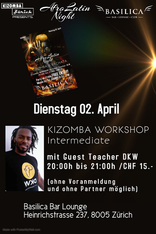 AFROLATIN NIGHT - Kizomba & Bachata DIENSTAG 02. April - KIZOMBA WORKSHOP Intermediate by DKW (CHF 15.-) - MUSIC by DJ Juanny & DJ JTM Workshop from 20:00h - 21:00h Party from 21:00h - open end "Das BASILICA ist am Dienstag schon ab 17:00h für alle geöffnet und der Eintritt ist frei". _____________________________ BASILICA - BAR * LOUNGE * CLUB Heinrichstrasse 237 8005 Zürich