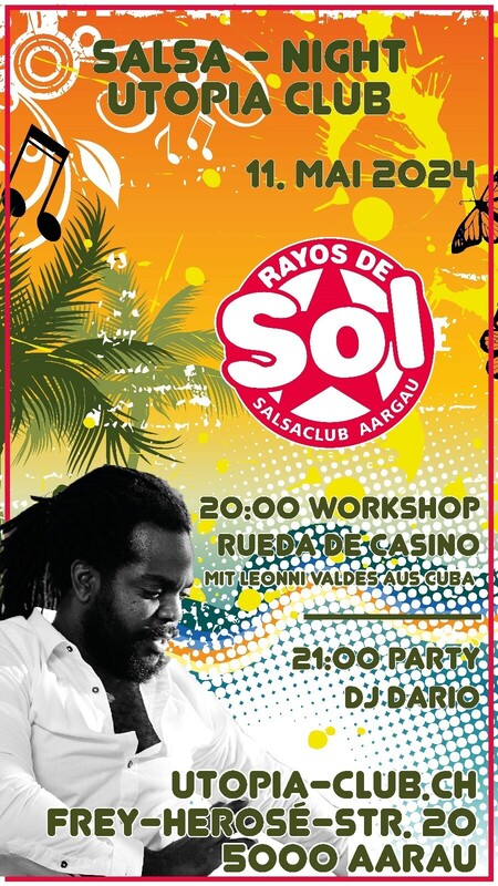 In Zusammenarbeit mit Salsa Club Aargau und Club Utopia in Aarau Immer am zweiten Samstag des Monats. DJ Dario Animation by "Leonni Valdes" Cuba. 20:00 - 21:00 Uhr Workshop "Rueda de Casino" mit Leonni Valdes aus Cuba ( 15.- pro Person ) 21:00 - 02.00 Uhr Salsa Party ( Eintritt 12.- ) www.rayosdesol.ch www.rayosdesol.ch www.rayosdesol.ch