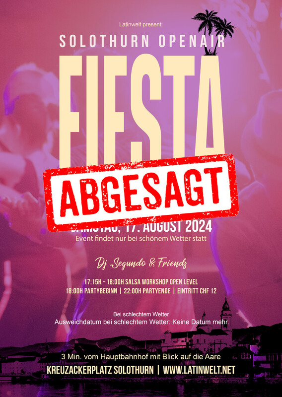 ⚠️ Der Event findet nur bei schönem Wetter statt. 👈🏽 Ausweichdatum bei schlechtem Wetter: 17. August 2024 Latinwelt präsentieren: ★FIESTA - OPEN AIR PARTY Tanzfläche aussen mit Blick auf die Aare Dj Segundo & Amigos Salsa, Bachata, Merengue, Reggaeton, Cha cha, Kizomba, Son! Zeit zum Geniessen! Zeit zum Feiern! ★Zeit: 17.15 Uhr bis 18.00 Uhr Bachata, Salsa Workshop! 18.00 Uhr bis 22.00 Uhr Party ★Preis: CHF 12.- Eintritt Party CHF 20.- Workshop + Party ★Informationen: - Tanzfläche mit Blick auf die Aare - Der Event findet nur bei schönem Wetter statt. - Ausweichdatum bei schlechtem Wetter: 17. August 2024 - 3 Minuten zu Fuss vom Hauptbahnhof Solothurn - Verschiedene Parkmöglichkeiten (z.B. Parkhaus Baseltor, Parkhaus Berntor) weitere Informationen unter www.latinwelt.net Anmeldung nicht zwingend.