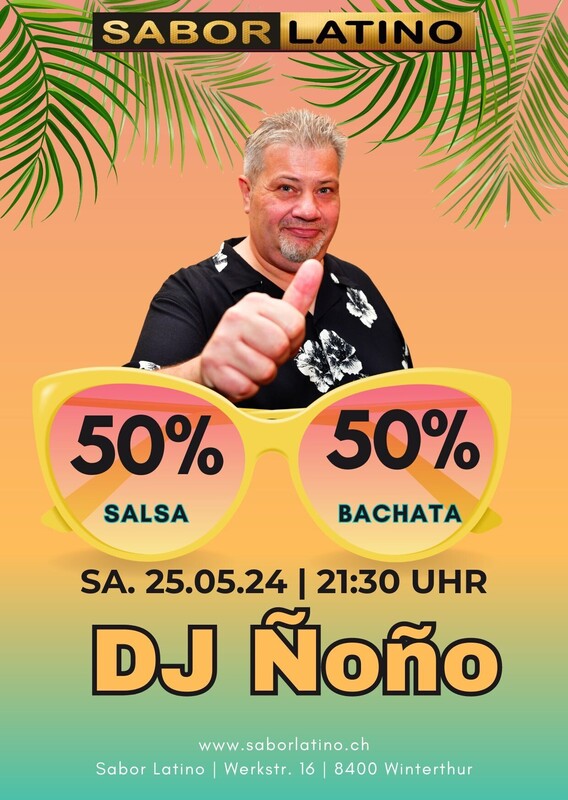 50 % Bachata / 50 Salsa mit DJ Ñoño Feiert mit uns die Salsa und Bachata Party mit DJ Ñoño. Geniesst eine perfekt Mischung aus 50 % Bachata u. 50 % Salsa. Erfrischt Euch an köstlichen Cocktails und entspannt Euch in den Lounges. DJ ÑOÑO Gratis Parkplätze hat es direkt vor dem Club. Mit dem ÖV ist das Sabor Latino einfach erreichbar. www.saborlatino.ch
