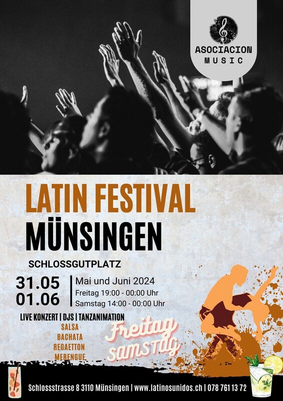 Münsingen Latin Festival 2024 Wann? Freitag, 31. Mai von 19:00 Uhr - 00:30 und Samstag, 01. Juni von 14:00 - 00:30 Uhr Wo? Auf dem Schlossgutplatz im Zentrum von Münsingen und Kirchgemeinde Was? Essen, Trinken, Tanzen, Spiele, Wettbewerbe, Gemütlichkeit, Kultur Das Münsingen Latin Festival ist ein kulturelles Ereignis, um den Schweizern Einblick in die lebensfrohe, herzliche Kultur Lateinamerikas zu geben. Von latieinamerikanischem Essen, Getränke, Musik, Konzerte, Shows, Animation und Tanz wird hier alles angeboten. Ein Fest bei dem sich jung und alt, aus verschiedenen Kulturen treffen um gemeinsam ein schönes Festival zu geniessen. Info: In der Kirchgemeindesaal Animation und Tanzen möglich bis um 00:30 Uhr Auf dem Schlossgutplatz Animation und live Gruppe bis um 22:00 Uhr / Ab 22:00 Uhr hintergrundmusik bis am 00:30 Uhr https://latinosunidos.ch/events/latinfestival/muensingen/2024.html