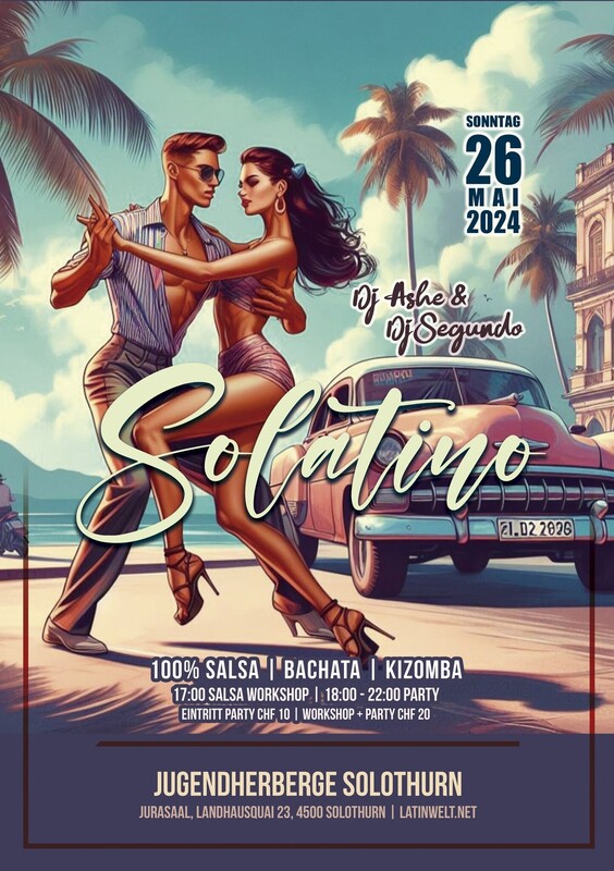 SOLATINO!!! ☀️🥳🍹🔥 Dj Ashe & Dj Segundo Salsa Workshop + Party! ------------------------------------------- ★★★ PARTY ★★★ ------------------------------------------- 100% Salsa, Bachata & Kizomba Party ab 18:00 Uhr bis 22:00 Uhr ---------------------------- ★★★ WORKSHOP ★★★ ---------------------------- 17:00 - 17:50 Uhr - Salsa Workshop (Open Level) Workshop setzt Vorkenntnisse voraus. ---------------------- ★★★ PREISE ★★★ ---------------------- AK.: CHF 10 Party | CHF 20 Workshop + Party ----------------------- ★★★ ADRESSE ★★★ ----------------------- Jugendherberge, Jurasaal Landhausquai 23, 4500 Solothurn 1. Stock ★ Weitere Informationen: - Programmänderung vorbehalten - Parkett Tanzboden - 5 Minuten zu Fuss vom Hauptbahnhof Solothurn - Verschiedene Parkmöglichkeiten in der Nähe Wir freuen uns auf Euren Besuch und auf einen unvergesslichen Tanzabend