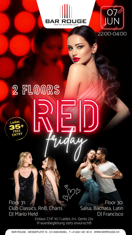Geniesse die ultimative Party auf 2 Floors! Schwinge im 30. Stock deine Hüften zu heissem, leidenschaftlichem und mitreissendem Salsa & Latin! Tanze mit uns durch die Nacht bis es hell wird. Join the club! Music: _Floor 30: Salsa, Bachata, Latin _Floor 31: Club Classics, RnB, Charts https://www.barrouge.ch/de/events/redfriday07062024/