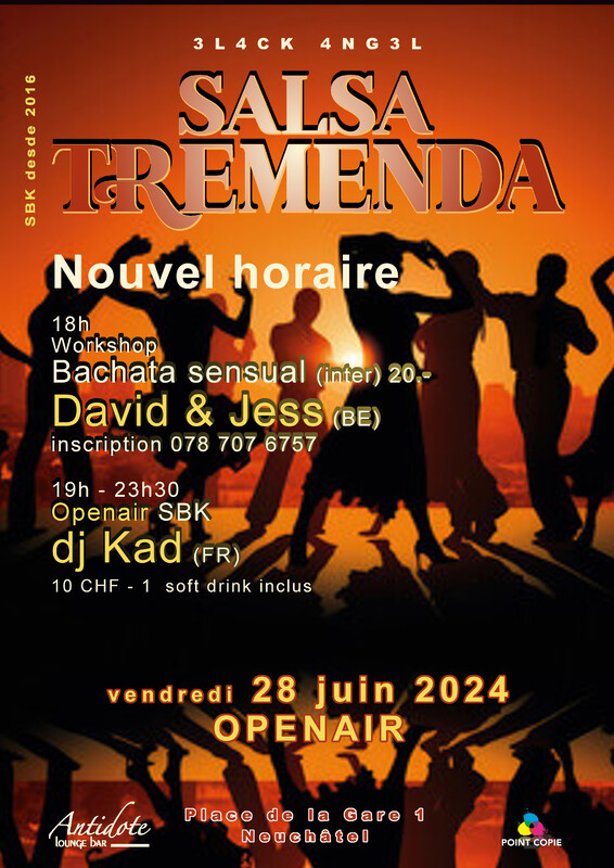 CONFIRMATION : l'évènement a lieu, pas de pluie: Salsa TREMENDA openair vendredi 28 juin 18h Workshop Bachata sensual (inter) 20.- David & Jess (BE) inscription 078 707 6757 19h Openair SBK dj Kad (FR) 10CHF - 1 soft drink inclus