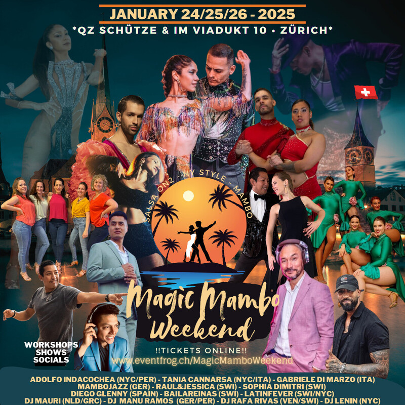 MagicMambo Weekend Zurich, Switzerland - January 24/25/26, 2025 2 Days of Workshops (Saturday-Sunday) 3 Socials (Friday-Saturday-Sunday) Our last edition was awesome ! You don't want to miss the next one! Join us for our next MagicMambo Weekend to learn, enjoy and dance together! Magic Mambo Weekend Zürich- Switzerland Salsa On2 - New York Style - Mambo January 24/25/26, 2025 QZ Schütze & Im Viadukt 10 - Zürich Tickets: www.eventfrog.ch/MagicMamboWeekend More Info: www.magicmambo.ch Line up - Dancers: -Tania Cannarsa (NYC/ITA) -Adolfo Indacochea (NYC/PER) -Gabriele di Marzo (ITA) -MamboJazz (GER) -Raul & Jessica (SWI) -Sophia Dimitri (SWI) -Diego Glenny (SPAIN) -BailaReinas (SWI) -LatinFever (SWI/NYC) Line up - DJs: -Mauri (NLD/GRC) -Manu Ramos (GER/PER) -Rafa Rivas (VEN/SWI) -Lenin (NYC) www.magicmambo.ch https://www.facebook.com/events/283614004789239/?acontext=%7B%22event_action_history%22%3A[]%7D https://www.youtube.com/shorts/QS5oXwcVkLU