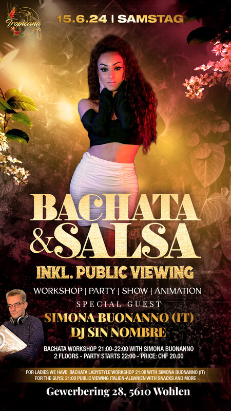SAMSTAG, 15.06.24 BACHATA & SALSA EVENT TROPICANA BACHATA SPECIAL *** BACHATA | SALSA *** *** 2 DANCE FLOORS *** *** SIMONA BUONANNO (ITALY) LADYSTYLE BACHATA WORKSHOP *** *** SPECIAL GUEST SIMONA BUONANNO (ITALY) BACHATA *** *** DJ SIN NOMBRE *** FULL PASS 20 CHF WORKSHOP 21:00-22:00 SIMONA BUONANNO (ITALY) LADYSTYLE BACHATA PUBLIC VIEWING 20:30-22:00 PUBLIC VIEWING ITALIEN-ALBANIEN PARTY START 22.00Uhr Lass dich entführen und geniesse die atemberaubende Magie der Event Location im Herzen vom Aargau in Wohlen! Es erwartet dich ein Spektakel mit bezaubernden Shows im ""TROPICANA"". === TROPICANA === Gewerbering 28 | 5610 Wohlen | Aargau Weniger anzeigen https://tropicanaclub.ch/next-events.html