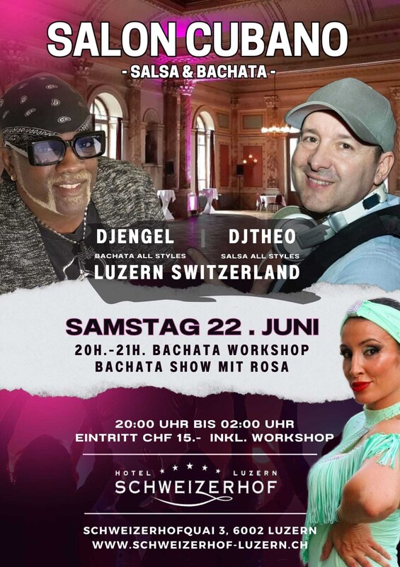 SAMSTAG 22. JUNI 2024 Herzlich Willkommen im LEGENDÄREN "SALON CUBANO " des 5-Sterne-Hotels Schweizerhof Luzern. SALON CUBANO Salsa All Styles - Bachata All Styles BRINGOLFSAAL (216 m2): Salsa All Styles und Bachata All Styles mit DJ Theo & DJ Engel 20h-21h. Bachata Workshop mit Rosa 23.30h. Bachata Show mit Rosa 20:00 Uhr bis 02:00 Uhr - Eintritt CHF 15.- Inkl. Workshop DAS 5 STERNE HOTEL SCHWEIZERHOF LUZERN liegt direkt am Vierwaldstättersee und in unmittelbarer Nähe zum Stadtzentrum von Luzern. ------------------------------------------------------------------ Viele Parkplätze Möglichkeiten in der Nähe: www.parking-luzern.ch HOTEL SCHWEIZERHOF LUZERN Schweizerhofquai 3, 6002 Luzern www.schweizerhof-luzern.ch https://www.facebook.com/share/Q2BZwXTwyYfbBcL4/