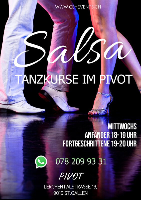 Salsa Kurse Mittwoch's im Pivot Anfänger von 18 - 19 Uhr Fortgeschrittene von 19 - 20 Uhr Kurs 4x 1 Std. (Pro Stunde CHF 25 CHF) Kurskosten: CHF 100.- Wichtig: Kurs Anmelden unter: info@ce-events.ch (078 209 93 31) Wir freuen uns auf schöne Kursabende mit euch ! www.ce-events.ch