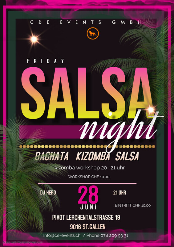 Lasst uns abtanzen und das Leben feiern am Freitag den 28. Juni im Pivot in St.Gallen!! Kizomba Workshop von 20.00 – 21.00 Uhr Workshop CHF 10 / Party: Eintritt CHF 10.00 Party ab 21.00 Uhr mit DJ Hero Workshop Anmeldung und Infos: Phone 078 209 93 31 oder per Mail: info@ce-events.ch Wir freuen uns auf einen schönen Abend mit Euch! www.ce-events.ch