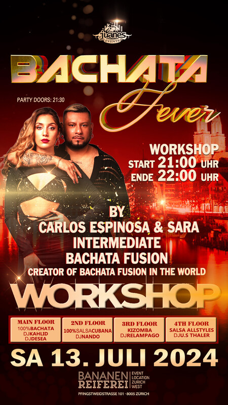 20:00 Uhr WORKSHOPS BY: * 20:00 Uhr MARCUS PAULO, Bachata Moderna, INTERMEDIATE *đŸ”„đŸ”„đŸ”„ * 21:00 Uhr CARLOS ESPINOSA & SARA, Creator of Bachata Fusion in the Worls BACHATA FUSION INTERMEDIATE *** Sie brauchen nicht zu buchen, kommen Sie direkt zum Bananenreiferei am Samstag 13. Juli um 19:50 Uhr. Der Workshop Preis ist CHF 25.- Inkl. Garderobe & Party auf 4 Dance Floors. đŸ”„đŸ”„đŸ”„ đŸ”„ BACHATA FEVER đŸ”„DJs KAHLID & DESEA - CARLOS ESPINOZA & SARA Workshop-Show Bananenreiferei by Juanes đŸ”„ Samstag 13. Juli 2024 đŸ”„ 4 DANCE FLOORS đŸ”„đŸ”„đŸ”„ đŸ”„ AB 22 JAHREN đŸ”„ DOORS: 21:30 – 04:00 UHR đŸ”„ EINTRITT CHF 20.- đŸ”„ EINTRITT: BEZAHLUNG AN DER KASSE NUR BARGELD đŸ”„ GRATIS GARDEROBE đŸ”„ 400 AUTO PARKPLÄTZE đŸ”„đŸ”„đŸ”„ SHOW: 00:00 Uhr by MARCUS, Solo Show. đŸ”„đŸ”„đŸ”„ SHOW: 00:00 Uhr by CARLOS ESPINOZA & SARA Bachata Fusion.workshp đŸ”„đŸ”„ Bienvenidos Juanes Events http://juanesevents.ch/