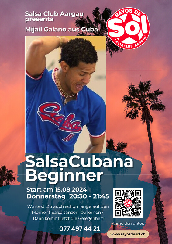 Nach einer erholsamen Sommerpause, starten wir wieder mit frischem Wind. Die Gelegenheit was neues anzureissen. Wir freuen uns auf Deine Anmeldung. Mit Tanzlehrer Mijail Galano aus Cuba. Anfänger-Kurs (ohne Vorkenntnisse) Anmelden unter www.rayosdesol.ch Salsa Club Aargau www.rayosdesol.ch