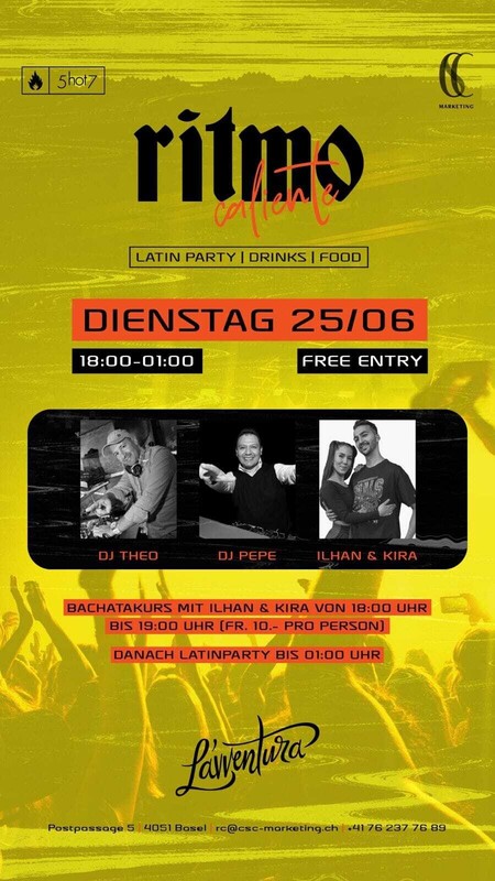 NEU Dienstag 25. Juni RITMO CALIENTE @ BASEL Salsa & Bachata Party mit DJ Pepe & DJ Theo 18.00 Uhr bis 19.00 Uhr BACHATA KURS mit ILHAN & KIRA (10.- pro Person) Danach Latin Party bis 01.00 Uhr - Eintritt Frei 18h - 01h Deine neue Open-Air-Party in Basel, jeden Dienstag von 18:00 Uhr bis 1.00 Uhr. Verpassen auf eigenes Risiko! Der Sommer ist kurz deshalb werden wir in vollen Zügen geniessen! Merke dir das Datum jetzt schon! L'Avventura Postpassage 5 / 9 Floor 4051 Basel
