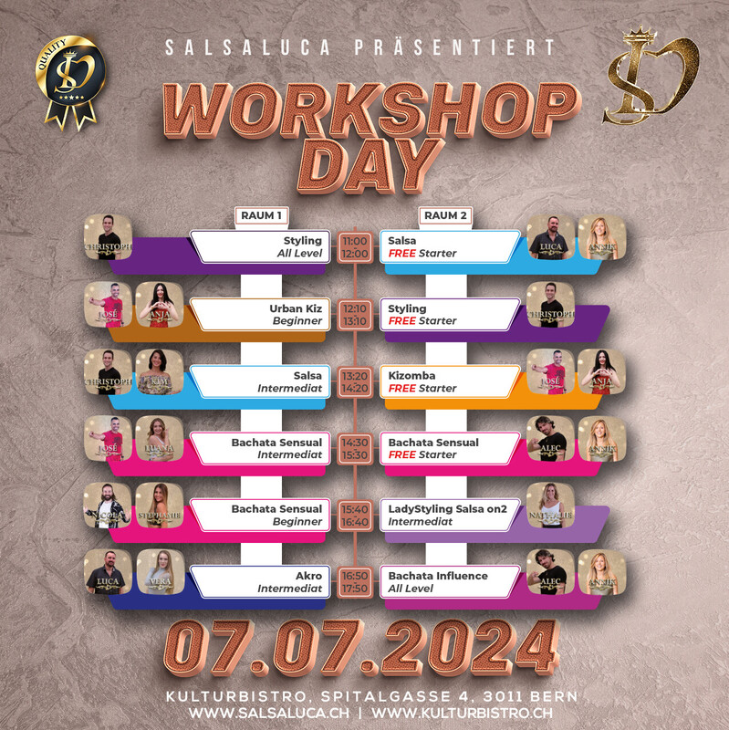 Wir haben geniale Workshops von Beginner bis Intermediat. Zudem haben wir die Gratis Starter Workshops (Salsa, Bachata, Kizomba und Styling) Infos hier: https://salsaluca.ch/kurse/workshop-day Tanzen verbindet – Werde Teil unserer Community bei den Salsaluca Workshop-Tagen! seid ihr bereit, in die Welt des Tanzes einzutauchen und eure Fähigkeiten auf ein neues Level zu heben? Bei Salsaluca, eurer Tanzschule mit Herz, bieten wir euch ab jetzt viermal jährlich einen ganz besonderen Tag an: Unsere Workshop-Tage! Ob ihr absolute Anfänger seid oder schon fortgeschrittene Tänzer, bei unseren Workshops ist für jeden etwas dabei. Ihr habt die Chance, in verschiedene Tanzstile wie Salsa, Bachata, Urban Kiz und Akrobatik reinzuschnuppern und euch von unseren erfahrenen Lehrern inspirieren zu lassen. Jeder Workshop ist speziell darauf ausgerichtet, euch intensiv in die Geheimnisse und Techniken des Tanzens einzuführen. https://salsaluca.ch/kurse/workshop-day