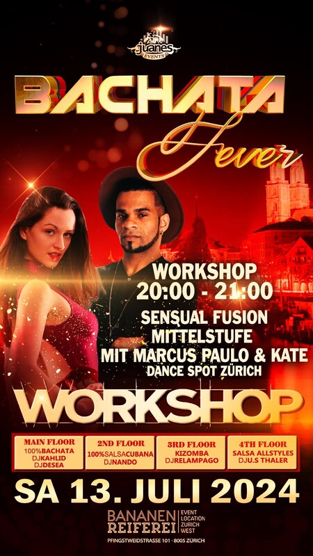 WORKSHOPS BY MARCUS PAULO & KATE @ đŸ”„BACHATA FEVER đŸ”„ Bananenreiferei 20:00 Uhr WORKSHOPS BY: * 20:00 Uhr MARCUS PAULO, Bachata Moderna, INTERMEDIATE *đŸ”„đŸ”„đŸ”„ * 21:00 Uhr CARLOS ESPINOSA & SARA, Creator of Bachata Fusion in the Worls BACHATA FUSION INTERMEDIATE *** Sie brauchen nicht zu buchen, kommen Sie direkt zum Bananenreiferei am Samstag 13. Juli um 19:50 Uhr. Der Workshop Preis ist CHF 25.- Inkl. Garderobe & Party auf 4 Dance Floors. đŸ”„đŸ”„đŸ”„ đŸ”„ BACHATA FEVER đŸ”„DJs KAHLID & DESEA - CARLOS ESPINOZA & SARA Workshop-Show Bananenreiferei by Juanes đŸ”„ Samstag 13. Juli 2024 đŸ”„ 4 DANCE FLOORS đŸ”„đŸ”„đŸ”„ đŸ”„ AB 22 JAHREN đŸ”„ DOORS: 21:30 – 04:00 UHR đŸ”„ EINTRITT CHF 20.- đŸ”„ EINTRITT: BEZAHLUNG AN DER KASSE NUR BARGELD đŸ”„ GRATIS GARDEROBE đŸ”„ 400 AUTO PARKPLÄTZE đŸ”„đŸ”„đŸ”„ SHOW: 00:00 Uhr by MARCUS, Solo Show. đŸ”„đŸ”„đŸ”„ SHOW: 00:00 Uhr by CARLOS ESPINOZA & SARA Bachata Fusion.workshp đŸ”„đŸ”„ Bienvenidos Juanes Events http://juanesevents.ch/