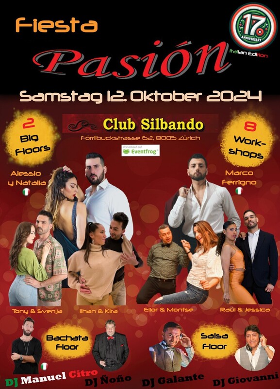 Fiesta Pasión - Deine Social-Dance Party am 2. Samstag des Monates im Club Silbando (ZH) feiert sein 17 jähriges Bestehen! Dazu haben wir MARCO FERRIGNO sowie ALESSIO Y NATALIA aus Italien eingeladen! Zusammen mit Schweizer Instruktoren werden insgesamt 8 Workhops am Samstag Nachmittag ab 13:15 Uhr angeboten. Am Abend findet ab 21:30 Uhr die Social-Party auf zwei grossen Dance-Floors (Salsa & Bachata) und 4 Djs u.a. mit DJ Manuel Citro aus Italien statt! Salsa- & Bachata Shows werden natürlich nicht fehlen! ;-) Das erwartet dich... Registration: 12:30 - 13:15 Uhr Bachata Workshops (Bachata Floor): - 13:15 - 14:15 Uhr: Ilhan y Kira (IK Studio) - Open Class - 14:20 - 15:20 Uhr: ALESSIO Y NATALIA (ITA) - Intermediate Class - 15:25 - 16:25 Uhr: Tony y Svenja (Smooth & Flow) - Intermediate Class - 16:30 - 17:30 Uhr: ALESSIO Y NATALIA (ITA) - Advanced Class Salsa-Workshop (Salsa Floor): - 13:15 - 14:15 Uhr: MARCO FERRIGNO (ITA) - Open Class On1 - 14:20 - 15:20 Uhr: Raul & Jessica (Salsabrosa) - Intermediate Class On1 - 15:25 - 16:25 Uhr: MARCO FERRIGNO (ITA) - Advanced Class On2 - 16:30 - 17:30 Uhr: Elior & Montse (SalsaOlé) - Intermediate Classe On2 Social-Party (ab 21:30 Uhr): - Bachata-Floor: DJ Manuel Citro (ITA) & DJ Ñoño - Salsa-Floor: DJ Galante & DJ Giovanni Shows:(ab 23:45 Uhr Salsa-Floor, ab 00:15 Uhr Bachata-Floor) - Raul & Jessica (Salsa) - Marco Ferrigno & Ansima Production ITA (Salsa) - Zurich Emenvi Couple Team (Bachata) - IK Team (Bachata) - Alessio y Natalia ITA (Bachata) Tickets: - Full-Pass (8 Workshops & Party): 100.- CHF - Half-Pass 1 (4 Workshops: 13:15 - 15:20 Uhr & Party): 60.- CHF - Half-Pass 2 (4 Workshops: 15:25 - 17:30 Uhr & Party): 60.- CHF - Party-Pass (nur Party ab 21:30 Uhr): 20.- CHF Vorverkauf: https://eventfrog.ch/de/p/party/latin-brasil/fiesta-pasion-17-jahre-jubilaeum-italian-edition-7202407432852585088.html?fbclid=IwZXh0bgNhZW0CMTAAAR0tAxW68dVV3b_9hy-TsprIaJ7xDr4JJO1i8TF2HSMmoz7jt47UpcM-j18_aem_5lQvDKB-jFIaiZE7UUmpBQ Dein Fiesta-Pasión Team https://eventfrog.ch/de/p/party/latin-brasil/fiesta-pasion-17-jahre-jubilaeum-italian-edition-7202407432852585088.html?fbclid=IwZXh0bgNhZW0CMTAAAR0tAxW68dVV3b_9hy-TsprIaJ7xDr4JJO1i8TF2HSMmoz7jt47UpcM-j18_aem_5lQvDKB-jFIaiZE7UUmpBQ