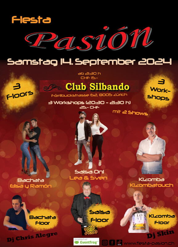 Fiesta Pasión- Deine Social-Dance Party am 2. Samstag des Monates im Club Silbando! Mit 3 Workshops, 3 Floors und 2 Shows! Das erwartet dich: *3 Workshops* von 20:30 - 21:30 Uhr (CHF 25.- inkl. Party-Eintritt): - Salsa On1 Workshop mit Sven & Lea (SalsaOlé, Salsa Aarau & Fuego y Pasión) -> Vorverkauf: https://eventfrog.ch/de/p/kurse-seminare/musik-tanz/salsa-workshop-mit-lea-sven-7218723912267326861.html - Bachata Workshop mit Elisa & Ramon -> Vorverkauf: https://eventfrog.ch/de/p/kurse-seminare/musik-tanz/bachata-workshop-mit-elisa-y-ramon-7218725672377644797.html - Urban Kiz Workshop mit Kizombatouch -> Vorverkauf: https://eventfrog.ch/de/p/kurse-seminare/musik-tanz/urban-kiz-workshop-mit-kizombatouch-7218726125320472282.html *3 Floors*: - Floor 1: Salsa mit DJ Ñoño - Floor 2: Bachata mit DJ Chris Alegre - Floor 3: Kizomba mit DJ Skin *2 Shows* (23:45 Uhr) - Salsashow von BDC Bailamos Dance Crew - Bachata-Show von Elisa y Ramon Vorverkauf Workshops und Party-Eintritt via Eventfrog: https://eventfrog.ch/de/p/party/latin-brasil/fiesta-pasion-7218726846258419327.html ●●● WHATSAPP/TELEGRAM: Komm in die WhatsApp- oder Telegram-Gruppe und bleibe über die kommenden Events informiert: Whatsapp: https://chat.whatsapp.com/DHgqcB4Pe8aFmjpYt2v03c Telegram: https://www.t.me/fiestapasion ●●● Fiesta Pasión Daten 2024: (jeweils am 2. Samstag des Monates) 12.10.2024 - 17th Anniversary "Italian Edition" 09.11.2024 14.12.2024 ------------------------------ Dein Fiesta-Pasión Team https://eventfrog.ch/de/p/party/latin-brasil/fiesta-pasion-7218726846258419327.html
