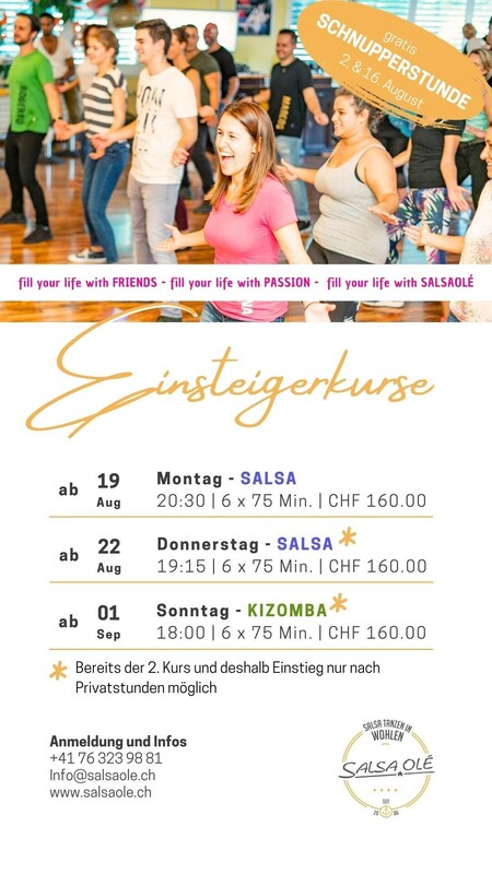 Einsteigerkurs SALSA Wir sind überzeugt: Salsa ist lernbar! Du bringst jede Menge Freude an Tanz und Musik sowie eine Prise Geduld mit, wir liefern dir ein gut durchdachtes und funktionierendes Konzept. Egal ob jung oder alt, Anfänger oder Fortgeschritten, Salsa, Bachata oder Kizomba, in unseren regulären Kursen und Workshops bieten wir für jedes Bedürfnis etwas Passendes! Salsa ist sicher die grösste unserer Leidenschaften und wir lieben und beherrschen jeden der 3 populärsten Salsa Stile gleichermassen. Jeder hat seinen Reiz und lässt dich die Musik auf verschiedene Weise interpretieren, weshalb wir alle drei Stile unterrichten und fördern. Für diesen Einsteigerkurs benötigst du keine Vorkenntnisse und wir freuen uns, dir das Tanzen Schritt für Schritt beizubringen :) www.salsaole.ch