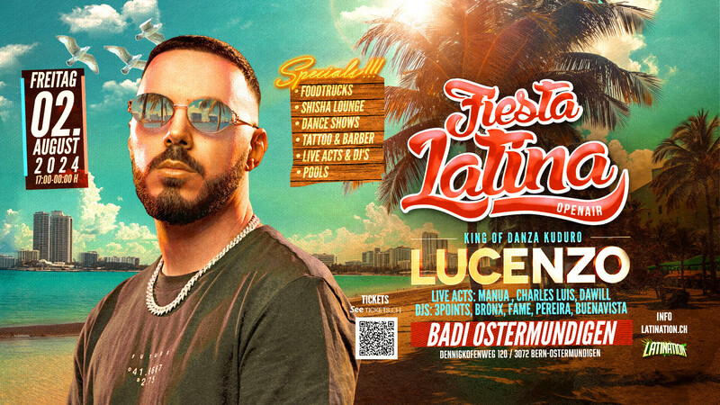 Latination presenta: 🌴 FIESTA LATINA OPENAIR ☀️ 2024 💯 REGGAETON, SALSA, BACHATA, MERENGUE, DEMBOW, BRASIL 🔥 LIVE ACTS + DJ'S 🔥 DANCE SHOWS 🔥 FOOD TRUCKS 🔥 POOLS 🔥 SHISHA LOUNGE 🔥 Afterparty @ Karma Bern Folge uns auf Instagram @latinationevents für Wichtige Infos rund um den Event! ACTS: 🎤 LUCENZO (King of Danza Kuduro) 🎤 CHARLES LUIS 🎤 DAWILL 🎤 MANUA 🎧 3POINTS 🎧 BRONX 🎧 FAME 🎧 PEREIRA 🎧 BUENA VISTA Bereitet euch auf das heisseste Event des Sommers vor – das Fiesta Latina Openair 2024 steht vor der Tür! Dieses Jahr wird es noch grösser, noch aufregender und noch unvergesslicher. Taucht ein in die mitreißenden Rhythmen von 100% Reggaeton, Salsa, Bachata, Merengue, Brasil, und Latin Pop und erlebt ein Fest der Superlative. Erlebt die elektrisierende Atmosphäre mit LIVE ACTS und DJ's, die euch mit den besten lateinamerikanischen Beats versorgen. Freut euch auf spektakuläre DANCE SHOWS, die euch zum Staunen bringen werden. Kulinarische Genüsse erwarten euch an unseren vielfältigen FOOD TRUCKS, während ihr euch an den POOLS erfrischen könnt. Entspannt in der SHISHA LOUNGE und lasst den Abend bei der legendären AFTERSHOW PARTY im Karma Club Bern ausklingen. Nach dem letztjährigen Erfolg, bei dem tausende von Fans der lateinamerikanischen Musik aus der ganzen Schweiz zusammenkamen, können wir es kaum erwarten, euch auch dieses Jahr wieder in der Badi Ostermundigen begrüßen zu dürfen. Genießt die Sonne, gönnt euch einen erfrischenden Drink am Pool und tanzt bis in die Nacht hinein zu den besten Klängen von Salsa, Merengue, Reggaeton, Bachata und mehr. Ein besonderes Highlight dieses Jahres ist der Auftritt von LUCENZO, dem König des Danza Kuduro, der mit seinen Hits weltweit für Begeisterung sorgt. Begleitet wird er von den talentierten Künstlern Charles Luis und Manua, die ebenfalls für unvergessliche musikalische Erlebnisse sorgen werden. Für das leibliche Wohl ist natürlich bestens gesorgt: Eine Vielzahl von Foodtrucks bietet euch köstliche Speisen aus der lateinamerikanischen Küche, von herzhaften Gerichten bis hin zu süßen Versuchungen. Das Fiesta Latina Openair 2024 wird eine unvergessliche Dayparty sein, die von 17:00 Uhr bis Mitternacht stattfindet. Direkt im Anschluss startet die offizielle Afterparty im Karma Club Bern, die im Eintritt inklusive ist. Feiere mit uns bis in die frühen Morgenstunden und erlebe die einzigartige Atmosphäre, die nur das Fiesta Latina Openair bieten kann. Verpasse nicht dieses Highlight des Sommers voller strahlender Leidenschaft, guter Vibes und inspirierender Momente. Sei dabei und feiere mit uns das Fiesta Latina Openair 2024! VAMOS! 🇪🇸Español: ¡Prepárate para el evento más caliente del verano: el Fiesta Latina Openair 2024 está a la vuelta de la esquina! Este año será aún más grande, más emocionante y más inolvidable. Sumérgete en los ritmos contagiosos del 100% Reggaeton, Salsa, Bachata, Merengue, Brasil y Latin Pop y disfruta de una fiesta de la más alta categoría. Vive la electrizante atmósfera con ACTOS EN VIVO y DJ's que te deleitarán con los mejores beats latinoamericanos. Disfruta de espectaculares SHOWS DE BAILE que te dejarán asombrado. Delicias culinarias te esperan en nuestros diversos FOOD TRUCKS, mientras te refrescas en las PISCINAS. Relájate en el SHISHA LOUNGE y culmina la noche en la legendaria FIESTA POSTERIOR en el Karma Club Bern. Después del éxito del año pasado, donde miles de fanáticos de la música latinoamericana de toda Suiza se reunieron, estamos ansiosos por darte la bienvenida nuevamente este año en la Badi Ostermundigen. Disfruta del sol, tómate un refrescante trago en la piscina y baila hasta la madrugada con los mejores sonidos de Salsa, Merengue, Reggaeton, Bachata y más. Un punto culminante especial de este año es la presentación de LUCENZO, el rey del Danza Kuduro, que con sus éxitos ha entusiasmado a nivel mundial. Estará acompañado por los talentosos artistas Charles Luis y Manua, que también te brindarán experiencias musicales inolvidables. Para tu deleite gastronómico, una variedad de food trucks te ofrecerán deliciosas comidas de la cocina latinoamericana, desde platos salados hasta dulces tentaciones. El Fiesta Latina Openair 2024 será una fiesta diurna inolvidable, que tendrá lugar desde las 17:00 hasta la medianoche. Justo después comenzará la fiesta oficial posterior en el Karma Club Bern, incluida en el precio de la entrada. Celebra con nosotros hasta las primeras horas de la mañana y vive la atmósfera única que solo el Fiesta Latina Openair puede ofrecer. No te pierdas este evento destacado del verano, lleno de pasión deslumbrante, buenas vibras y momentos inspiradores. ¡Únete a nosotros y celebra el Fiesta Latina Openair 2024! ¡VAMOS! ___________________________ ANREISE: RBS Bus 44 Haltestelle «Ostermundigen, Freibad» Ab Bern: Bern Mobil Bus Nr. 10 Richtung Ostermundigen, Wegmühlegässli Umsteigen auf RBS Bus 44 Richtung Gümligen Haltestelle «Ostermundigen, Freibad» oder S2 Bahn Richtung «Ostermundigen Bahnhof» Umsteigen RBS Bus 44 Richtung Gümligen Haltestelle «Ostermundigen, Freibad» ***AUSSERHALB DER RBS-FAHRZEITEN FAHREN OPENAIR SHUTTLE BUSSE AN DEN MARKIERTEN STATIONEN ZWISCHEN BADI OSTERMUNDIGEN UND BAHNHOF OSTERMUNDIGEN*** ___________________________ LOVE | MUSIC | FOOD | DANCE