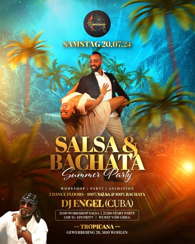 SAMSTAG, 20.07.24👇🏻 SALSA & BACHATA EVENT TROPICANA SALSA SPECIAL *** SALSA | BACHATA *** *** 2 DANCE FLOORS *** *** FRANKY & STEFY SALSA WORKSHOP *** *** DJ ENGEL (CUBA) *** FULL PASS 15 CHF WORKSHOP 21:00-22:00 FRANKY & STEFY (ITALY) SALSA PARTY START 22.00Uhr Lass dich entführen und geniesse die atemberaubende Magie der Event Location im Herzen vom Aargau in Wohlen! Es erwartet dich ein Spektakel mit bezaubernden Shows im „“TROPICANA““. === TROPICANA === Gewerbering 28 | 5610 Wohlen | Aargau Weniger anzeigen https://tropicanaclub.ch/next-events.html