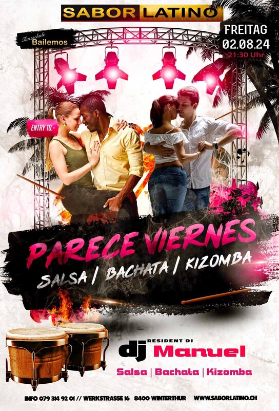 Die richtige Party, um das Wochenende zu beginnen. Mit wechselnden DJ`s immer Salsa, Bachata und Kizomba und auch mal Reggaeton. DJ Manuel: Salsa, Bachata, Kizomba Free Parking vor dem Club und mit dem ÖV ist das Sabor Latino einfach erreichbar bis Haltestelle Grüzenstrasse oder Brücke. Auch die Nachtbusse fahren im 1/2 Stundentakt an und ab diesen Haltestellen. Im Sabor Latino gibt es auch eine Tanzschule: www.bailemos.ch www.saborlatino.ch