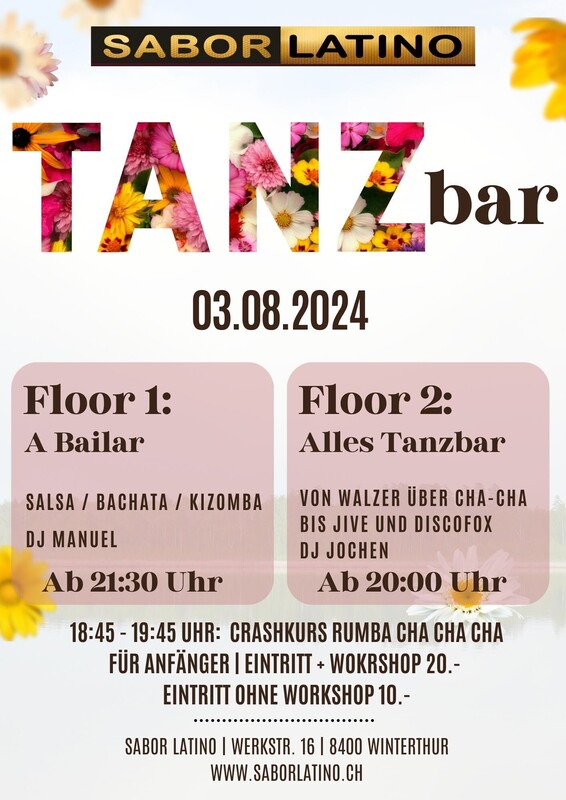 Tanzbar, die  Party für alle Freunde der Tanzmusik, von Salsa, Bachata, Kizomba, Discoswing, Rumba, Walzer, Jive, Tango und mehr. Auf 2 Dancefloors legen legen die DJ`s die beste auf. In den Lounge kann man sich zwischendurch mit einem unserer feinen Cocktails entspannen und für neue Tänze aufladen. Salsafloor: DJ Manuel Standardfloor: Jochen 18:45 - 19:45 Uhr: Chrashkurs Rumba (Standard) u. Cha cha cha Anmeldung: https://docs.google.com/forms/d/e/1FAIpQLSdaPMndiBCpWjICFiBwZDClVf5mtCuQAVY9qqRzoPCsFyM60g/viewform