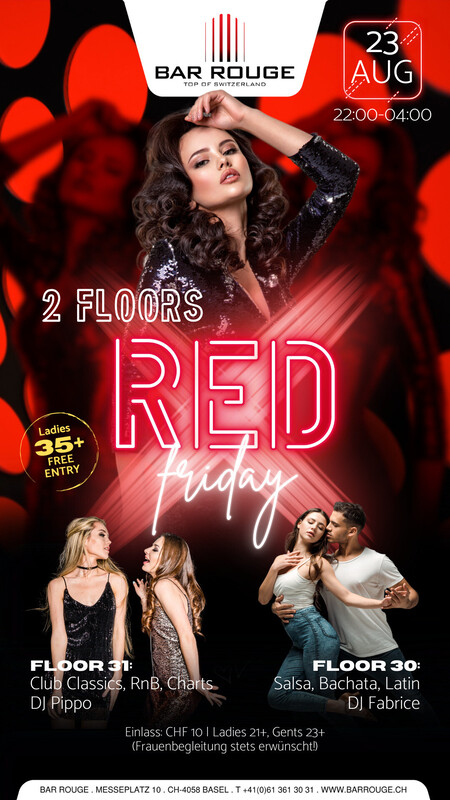 Geniesse die ultimative Party auf 2 Floors! Schwinge im 30. Stock deine Hüften zu heissem, leidenschaftlichem und mitreissendem Salsa & Latin! Tanze mit uns durch die Nacht bis es hell wird. Join the club! Music: _Floor 30: Salsa, Bachata, Latin _Floor 31: Club Classics, RnB, Charts https://www.barrouge.ch/de/events/redfriday23082024/