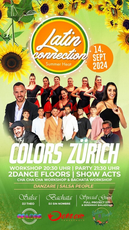 Herzlich wilkommen bei Latin Connection Event im COLORS CLUB Zürich mit 2 Dance Floors. SAMSTAG 14.09.2024 ☆☆☆ SPECIAL GUEST ☆☆☆ ♡♡♡ FULL PROJECT (IT) ♡♡♡ ================================================================================ ► PARTY AUF 2 DANCE FLOORS AB 21:30 Uhr ► 2 Gratis Workshops 20:30 Uhr - 21:15 Uhr ► Top Location ► 2 Show Acts ► 1 Big Entertainment ► Best Salsa, Bachata DJ‘s ► Best Salsa, Bachata Teachers ================================================================================ ♡ WELCOME AND ENJOY THE PARTY ♡ • MAIN FLOOR: SALSA im Purple Room -Salsa Puertorriqueña,Timba, Salsa All-Styles, Salsa Romantica, Cha cha cha -On the Mix DJ THEO • 2ND FLOOR: BACHATA im Blue Room - 100% Bachata - On the Mix DJ SIN NOMBRE ► LIVE ACTS ca. 23:30 Uhr im MAIN FLOOR ☆FULL PROJECT (IT) ☆ SERENWAY BAILADORO ================================================================================ ► WORKSHOPS PROGRAMM 20:30 Uhr - 21:15 Uhr ALL LEVELS WS01 | CHA CHA CHA FULL PROJECT (IT) WS02 | BACHATA PASCAL & SABRINA DANZARE ================================================================================ ► PREIS Full Pass 2 GRATIS Workshops und Party CHF 25. - ================================================================================ ► LOCATION: === THE COLORS === Vulkanstrasse 130 | 8048 Zürich - Swiss life Arena https://salsapeople.ch/workshop/