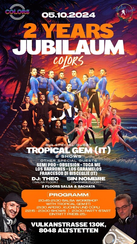 SAMSTAG, 05.10.2024 SALSA & BACHATA EVENT ***** IT'S MY BIRTHDAY ***** Bald ist es soweit!! Am 05.10.2024 findet wieder die Meeega Geburtstagsparty vom COLORS CLUB statt. THE COLORS wird 2 Jahr alt und dieses Jahr wird es wieder einmal ein ganz besonderes Fest. Am Abend werden euch dann wieder viele Überraschungen und viele Shows erwarten!! *** SALSA | BACHATA *** *** 2 DANCE FLOORS *** *** TROPICAL GEM WORKSHOP *** *** 14 SHOWS *** *** DJ THEO*** *** DJ SIN NOMBRE*** WORKSHOP PLAN 20:45-21:30 SALSA WORKSHOP WITH TROPICAL GEM (IT) APERO: 21:30 Apero, Kuchen und Cüpli SHOW ACTS: 22:15-23:00 Carolina Sosa show tropical gem Francesca Loreto show Tropical gem Sofia tanfoglio show tropical gem Gabriel Arpino show tropical gem Samuele e mirko show tropical gem Victoria Cambiasso show sosa style Sosa style dancers Tropical gem next gen Francesco Di Bisceglie Semi Pro Salsa People Obsesion Toca Me Los Barrones Los Caramelos PARTY START - 23.00Uhr Preis: Show, Workshop, Champagner, Kuchen und Party 25.- CHF Lass dich entführen und geniesse die atemberaubende Magie der neuen Event Location im Stadion der SWISS LIFE ARENA In Zürich! Es erwartet dich ein Spektakel mit bezaubernden Shows im THE COLORS . === THE COLORS === Vulkanstrasse 130 | 8048 Zürich - Swiss life Arena https://salsapeople.ch/workshop/