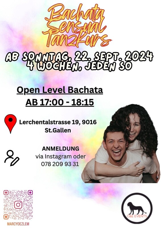 Neu: Tanzkurs Bachata Sensual Open Level jeweils Sonntags von 17 Uhr bis 18.15 Uhr 4x 1 Std. 22.Sept. 29.Sept. 06.Okt. 13.Okt. Kurskosten: CHF 100.00 Wichtig: Kurs Anmeldung unter: info@ce-events.ch oder Phone 078 209 93 31 Wir freuen uns auf schöne Kursabende mit euch ! www.ce-events.ch