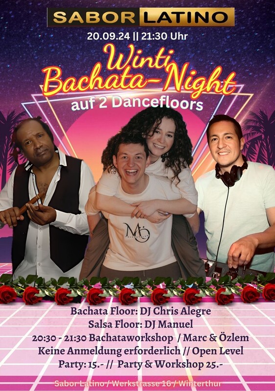 Winti Bachata Night An dieser Party kommen alle Tanzbegeisterten auf ihre Kosten: Bachata-Liebhaber können ihre Leidenschaft mit Bachata, Fusion und Sensual auf dem Haupttanzfloor ausleben. Doch auch Salsa- und Kizomba-Fans kommen auf dem zweiten Tanzfloor voll auf ihre Kosten. Feiere mit uns eine Nacht voller Leidenschaft, Tanz und Musik! Floor 1: DJ Chris Alegre 100 % Bachata Floor 2: DJ Manuel Salsa 20:30 -21:30 Bachata Workshop mit Marc & Özlem // Open Level / ohne Anmeldung Eintritt ohne WS 15.- // incl. Workshop: 25.- https://saborlatino.ch/events/winti-bachata-night-auf-2-dancefloors-19-04-24/