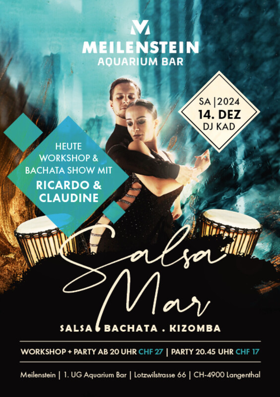 πŸ’ƒ Salsa Mar πŸ’ƒ Die Bar im 1.UG ist das GlanzstΓΌck des Aquariums Langenthal. SΓΌsswasserbecken auf 42 Metern LΓ€nge verzaubern die GΓ€ste von der ersten Sekunde an. Unterwasserwelten vom Amazonas bis nach Siebirien mit atemberaubenden Flussmonstern und farbengewaltigen Amazonasfischen kΓΆnnen hier trockenen Fusses bestaunt werden. Freuen Sie sich bei. πŸ’ƒSalsa MarπŸ’ƒ Auf einen Workshop fΓΌr Tanzbegeisterte ab 20.00-20.45 und anschliessend 20.45 auf eine heisse Party In beeindruckender Kulisse bis 02.00 Workshop & Party. 27.- 20.00-02.00 /Party 17.- 20.45-02.00 πŸ’ƒ Workshop πŸ’ƒ Bachata mit Ricardo & Claudine und im spΓ€teren Abend geben sie noch eine Bachata Show Freundlich erwarte ich Dich auf eine weitere Unvergessliche Party Lg Reto & Team