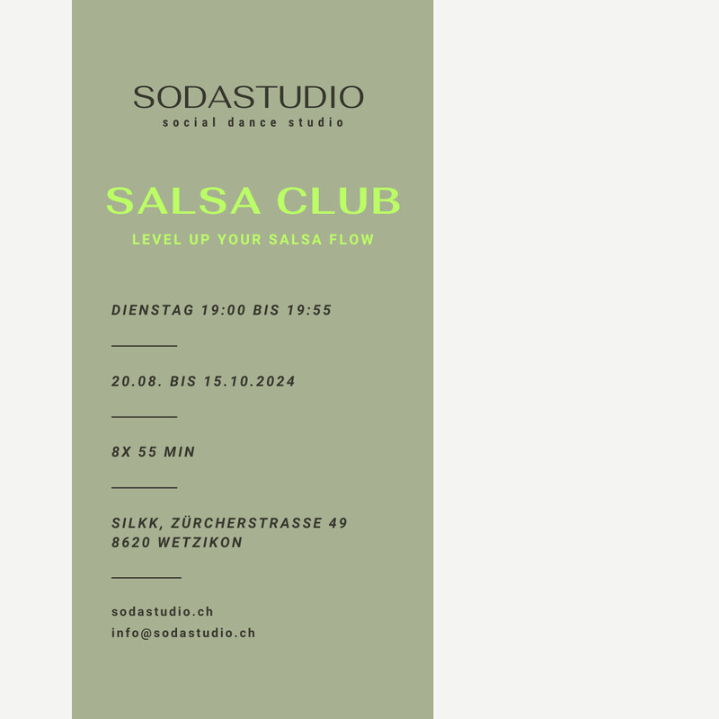 Salsa Club für Salsa Cubana Tänzer:innen Möchtest du tiefer in die Partnerwork Techniken einsteigen, neue Paar-Figuren und andere Elemente lernen? Oder vielleicht tanzt du eine Weile, aber dein Social Dance ist etwas eingerostet, oder fühlt sich immer gleich an? Dann ist das DEIN KURS! (Voraussetzung: Mindestens 12 Monate Tanzschulerfahrung in Salsa) Ziel des Kurses ist es, das Verständnis für den Tanz weiter auszubauen und zu vertiefen. Der Schwerpunkt des Kurses liegt im Aufbau von neuen Figuren und dem Verbessern deiner Tanztechnik. Wir befassen uns mit Schulterbewegungen, Lauftechniken und bauen darauf erste Stylings der neu erlernten Figuren auf. Was du in diesem Kurs lernst: - Du lernst neue Figuren/Kombinationen, die du auf der Tanzfläche anwenden kannst. - Du verbesserst deine Partnerwork Technik und wirst besser im Führen und Folgen. - Du kannst erste Stylings in dein Social Dance einbauen. Kursdaten und Preis: DI 20. August bis DI 15. Oktober 2024 | 19:00 - 19:55 (DI 1. Oktober kein Kurs) 8x 55 Min. | 240.-/Person Deine Tanzlehrer: Wir, Francesco und Mirjam von sodastudio, freuen uns darauf, dich auf deinem tänzerischen Weg zu begleiten und mit dir viele unterhaltsame und lehrreiche Stunden zu verbringen! Kontakt bei Fragen: Du kannst uns jederzeit über unser Kontaktformular auf sodastudio.ch oder per Mail info@sodastudio.ch kontakieren. https://www.silkk.ch/kurse/Salsa-Club5-10-2024-19009-10-24-38-42-73