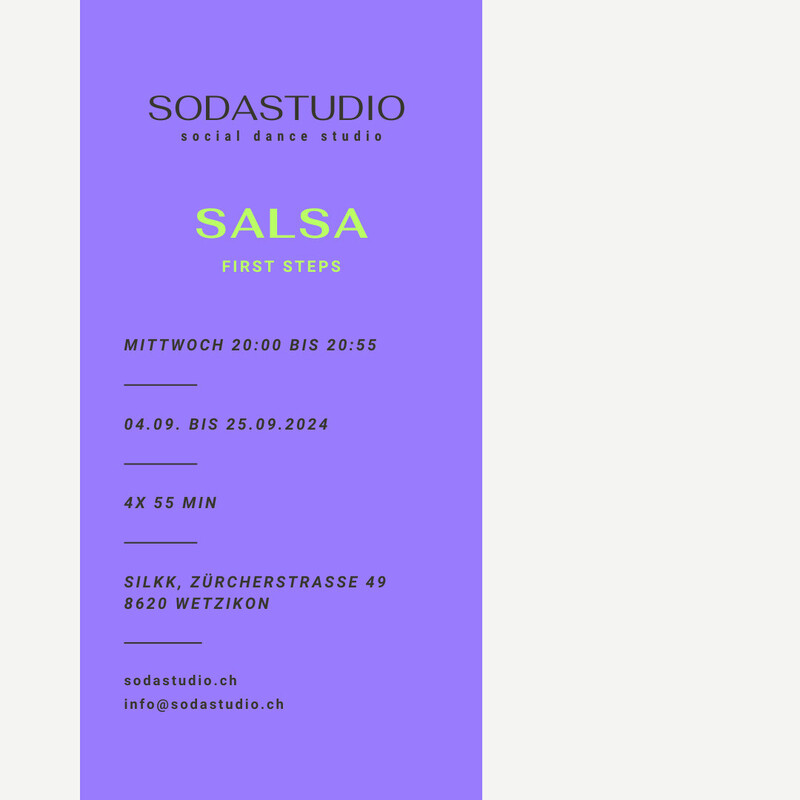 Starte deine Salsa Reise mit uns! Unsere Salsa First Steps Class richtet sich an Teilnehmer ohne Vorkenntnisse, an Wiedereinsteiger und an alle, die Interesse haben ihre Grundlagen asuzubauen und zu festigen. In 3 Lektionen lernst du die wichtigsten Grundlagen des Salsa, wir erklären dir den Aufbau von Salsa Musik und du lernst anhand von coolen Übungen die Rhythmik zu verstehen und mit deinem Körper umzusetzen. Lass dich von uns auf eine Reise voller Spass, Musikalität und Lebensfreude mitnehmen! Was du in diesem Kurs lernst: - Du lernst den Grundschritt und verschiedene Variationen des Grundschritts. - Wir schulen dein Taktgefühl und vermitteln dir erste Konzepte im Führen und Folgen. - Du lernst die wichtigsten Positionen und erste Figuren. - Du übst mit und ohne Partner (Anmeldung auch ohne Tanzpartner möglich). Kursdaten und Preis: MI 04. September bis MI 25. September 2024 | 20:00 - 20:55 4x 55 Min. | 120.-/Person Deine Tanzlehrer: Wir, Francesco und Mirjam von sodastudio, freuen uns darauf, dich auf deinem tänzerischen Weg zu begleiten und mit dir viele unterhaltsame und lehrreiche Stunden zu verbringen! Kontakt bei Fragen: Du kannst uns jederzeit über unser Kontaktformular auf sodastudio.ch oder per Mail info@sodastudio.ch kontakieren. https://www.silkk.ch/kurse/Salsa-Starter24-08-2024-19009-76