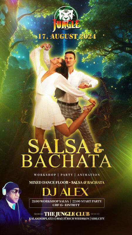 SALSA & BACHATA EVENT JUNGLE NIGHT * WORKSHOP * * MIRCO & LILI * * MIXED FLOOR * * DJ ALEX (Cuba) * Timetable 21:00 Workshop 22:00 Party Party | Workshop | Animation 15 CHF Eintritt www.thejungleclub.ch