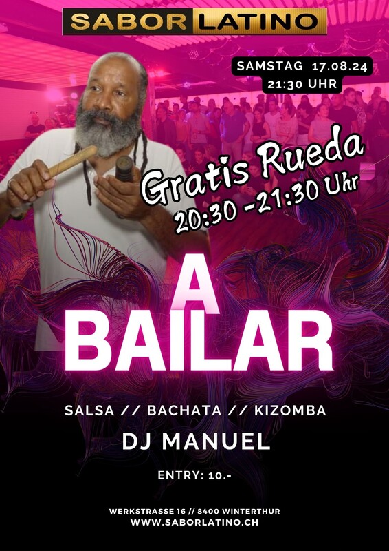 A Bailar, karibische Lebensfreude präsentiert durch die beste Musik von unseren DJ`s. Salsa, Bachata, Kizomba und auch Merengue wird er auflegen. Floor 1: DJ: Manuel Salsa / Bachata / Kizomba 20:30 - 21:30 Uhr: Gratis Rueda mit Franz www.saborlatino.ch