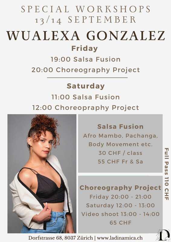 13. September 19:00 Salsa Fusion 20:00 Choreography Project 14. September 11:00 Salsa Fusion 12:00 Choreography Project After our summer intensives we will offer two Salsa Fusion classes, where you can put to the test your acquired skills. There will also be a special choreography project with a video shoot at the end to preserve this amazing experience. Don’t miss the last chance to learn from Wualexa for this year and sign up today! Registration: https://forms.office.com/r/2jt8VumJha www.ladinamica.ch