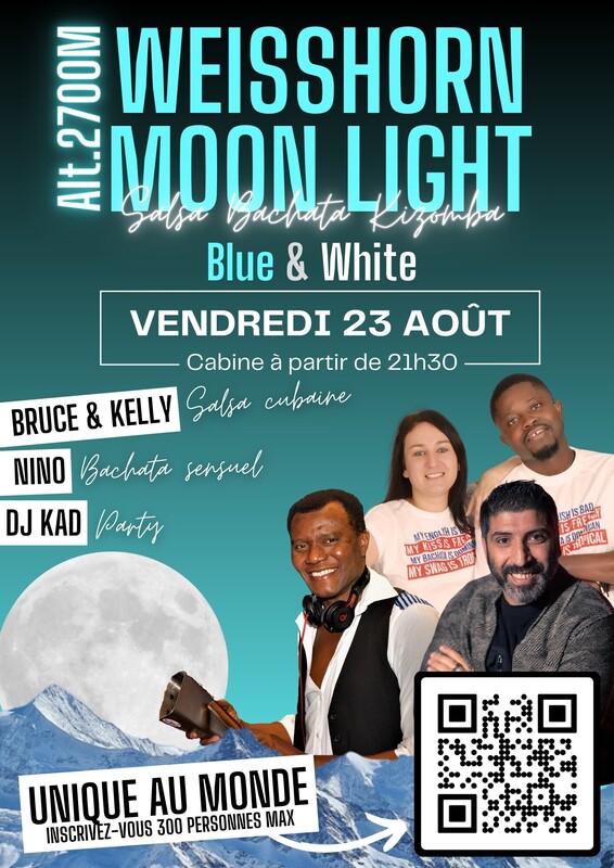 Soirée Salsa et Bachata sous la Pleine Lune à l'Espace Weisshorn, Grimentz Venez vivre une soirée inoubliable au sommet des montagnes, à l'Espace Weisshorn, à 2700 mètres d'altitude ! Avec un panorama spectaculaire et la pleine lune éclairant la nuit, profitez d'une ambiance magique et festive. Programme de la soirée : 18h00 - 18h30 : Inscription et montée en cabine depuis Grimentz Inscrivez-vous et montez au restaurant d'altitude pour une expérience unique. 19h00 - 20h15 : Workshop Salsa Cubaine intermédiaire et Bachata Sensuel débutant. 19h00 - 19h30 : Inscription et montée en cabine depuis Grimentz Inscrivez-vous et montez au restaurant d'altitude pour une expérience unique. 20h15 - 21h30 : Workshop Bachata Sensuelle intermédiaire et Salsa Cubaine débutant. 21h00 - 22h00 : Arrivée pour la soirée à Grimentz Assurez-vous d'arriver avant 22h00. Les cabines montent de 21h30 à 22h00 dernière cabine. 21h30 : Apéro de bienvenue Savourez un apéro de bienvenue en arrivant au sommet et commencer à danser avec DJ KAD et DJ SMILE 21h30 - 02h00 : 2 Dancefloor : ***Salsa dancefloor - DJ KAD ***Bachata & Kizomba - DJ SMILE Dansez sous la pleine lune jusqu'à 2h du matin. La lune se lèvera à 22h10, offrant une vue imprenable sur les montagnes. Avec boissons à VOLONTÉ. 23h45 : Show de danse Profitez d'un show spectaculaire par Bruce et Kelly, suivi d'une performance de Nino et sa partenaire. 01h00 - 02h15 : Descente en cabine Les descentes en cabine commenceront à 1h et se poursuivront jusqu'à 2h15 dernière descente. Infos supplémentaires : https://sites.google.com/view/weisshornmoonlight/accueil Découvrez les activités disponibles dans la région avant la soirée sur notre site internet. Le lendemain, assistez à l'arrivée de la course de vélo du Grand Raid et participez à la raclette party pour une journée mémorable. Pour plus d'informations et pour vous inscrire, visitez notre site internet et suivez-nous sur Instagram. www.kad-events.ch