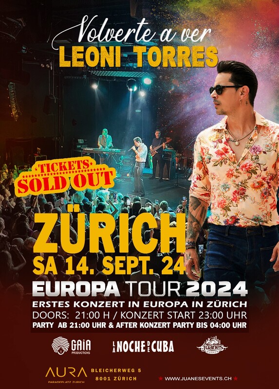 ★ LEONI TORRES ★ Live in ZÜRICH ★ Samstag 14. Sept. AURA CLUB Presented by Juanes Events & Gaia Productions dieses Konzert verspricht eine unvergessliche Nacht voller Emotionen, Energie und unverglechlicher Musik. ●●●● Informationen für das Konzert von Leoni Torres, Tickets und Programm. ●●●● Tickets für das Leoni Torres Konzert sind ausverkauft. Wir haben 4 Eingänge, um Ihnen einen schnellen und effizienten Eintritt zu ermöglichen ★ 2 Scanner mit Juanes Personal am Eingang Talstrasse ★ 2 Scanner mit Juanes-Mitarbeitern am Eingang Bleicherweg ★ Alle Eingänge mit Juanes Bändeli ●●●● ZEITPLAN: ★ 1. Einlass: 21:00 Uhr Die Party beginnt mit den DJs Alex & Manuel ★ 2. Konzert von Leoni Torres 23:00 Uhr Das Konzert wird eineinhalb Stunden dauern + - ●●●● 3. After Party ab 00:30 Uhr Ab 00:30 Uhr können Sie die After Party bis 04:00 Uhr besuchen. Eintritt CHF 15.- ●●●● ★ KONZERT ★ Erleben Sie eine unvergessliche Nacht voller leidenschaftlicher Rhythmen unt mitreissender Musik mit dem kubanischen Superstar! ►Einziges Konzert in der Schweiz ► Kontrolle des Tons und Umfangs angepasst, um ein gutes Konzert zu genießen. ► Gehörschutz Stöpsel ●●●● ★ ANFAHRT ★ ✪ TRAM & BUS ► Weg zur AURA CLUB von Zürich (HB), mit dem Tram Nr. 4, 13, 11 bis PARADEPLATZ, 2Mint. zu Fuss bis Aura Club SEARCH PLAN: https://search.ch/.../AURA-Group-AG,Z%C3%BCrich... ●●●● ★ INFOS & KONTAKT ★ Telf: 079 344 50 92 Mail: juan@juanesevents.ch www.juanesevents.ch ●●●● Bienvenidos Juan & Monika Juanes Events & Gaia Productions ★★★ Leoni Torres, kubanischer Sänger, Komponist und Produzent, verfügt über sieben Soloalben und hat mit renommierten Musikgrössen wie Rosario Flores, Pablo Milanés, Willy Chirino, Gilberto Santa Rosa, Beatriz Luengo, Francisco "Pancho" Céspedes, Carlos Varela, Kelvis Ochoa und Cimafunk zusammengearbeitet. Die Singles "Toda una vida", "Para Que Un Día Vuelvas" und "Las Cosas Que Te Pido" wurden mit Gold- und Platinplatten sowie Auszeichnungen der RIAA geehrt. "Es tu mirada" und das Cover von "Idilio" waren grosse Erfolge in seiner Karriere und haben derzeit über 270 Millionen Views auf YouTube. Mit dem Song "Me Quedo Contigo" debütierte er vier aufeinanderfolgende Wochen in den Billboard-Charts "Tropical Songs" und erreichte mit dem Hit "Deja la tristeza" eine Platzierung in der Spotify-Playlist "Tropical Rising". Sein Album "Alma Cubana" wurde 2021 für den Latin Grammy in der Kategorie "Bestes traditionelles tropisches Album" nominiert. Im Jahr 2022 erhielt er zum zweiten Mal in Folge eine Nominierung für den Latin Grammy in derselben Kategorie für sein Album "Canten - Hommage an Pablo Montañez" http://juanesevents.ch/