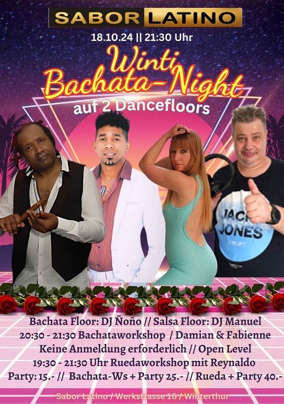 Winti Bachata Night An dieser Party kommen alle Tanzbegeisterten auf ihre Kosten: Bachata-Liebhaber können ihre Leidenschaft mit Bachata, Fusion und Sensual auf dem Haupttanzfloor ausleben. Doch auch Salsa- und Kizomba-Fans kommen auf dem zweiten Tanzfloor voll auf ihre Kosten. Feiere mit uns eine Nacht voller Leidenschaft, Tanz und Musik! Floor 1: DJ Ñoño 100 % Bachata Floor 2: DJ Manuel Salsa 20:30 -21:30 Bachata Workshop mit Damian & Fabienne (WS + Party 25.-) ohne Anmeldung 19:30 -21:30 Rueda mit Reynaldo WS incl. Party 40.- Eintritt ohne WS 15.- https://saborlatino.ch/events/winti-bachata-night-auf-2-dancefloors-19-04-24/