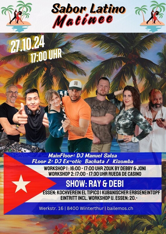 SABOR LATINO MATINEE, seit über 10 Jahren die Party am Sonntagnachmittag für alle die Salsa, Bachata und Kizomba lieben. Hast du Lust auf eine Salsa, Bachata und Kizomba-Party, die dich zum Schwitzen bringt? Dann komm zum Sabor Latino Matinee! Hier gibt es nicht nur einen, sondern gleich zwei Dancefloors, auf denen du zu den heißen Rhythmen unserer DJ`s das Tanzbein schwingen kannst. Aber bevor du dich in das Party-Getümmel stürzt, hast du die Möglichkeit, bei einem Workshop deine Tanz-Skills zu verbessern. Unsere professionellen Tanzlehrer werden dir zeigen, wie du dich elegant auf dem Parkett bewegst und dabei eine Menge Spaß hast. Danach darfst du dein Können beim Rueda ausprobieren und dein Glück beim Tanzen in der Gruppe versuchen. Und wenn du zwischendurch eine Pause brauchst, kannst du Dir an der Bar einen feinen Cocktail gönnen und um 18:30 Uhr von den köstlichen Düften eines feinen Menus von unserem Kochverein el Tipico verführen lassen. Also komm vorbei und verbringe eine unvergessliche Zeit mit uns auf der Sabor Latino Matinee! Floor 1 DJ Manuel mit Salsa Floor 2 DJ Ex-Otic Bachata | Kizomba Liveact: Salsa by Ray & Deby Essen: Kubanischer Erbseneintopf vom Kochverein El Tipico 2 Workshops: 16:00 – 17:00 Uhr Zouk mit Debby & Janni 17:00 – 17:30 Uhr Rueda mit Franz Vor dem Sabor Latino stehen genügend gratis Parkplätze zur Verfügung. Anreise mit dem Auto: Wegbeschreibung: An – Abreise mit dem ÖV bis Werkstr. 16: Zum Fahrplan https://saborlatino.ch/events/sabor-latino-matinee-am-sonntagnachmittag/