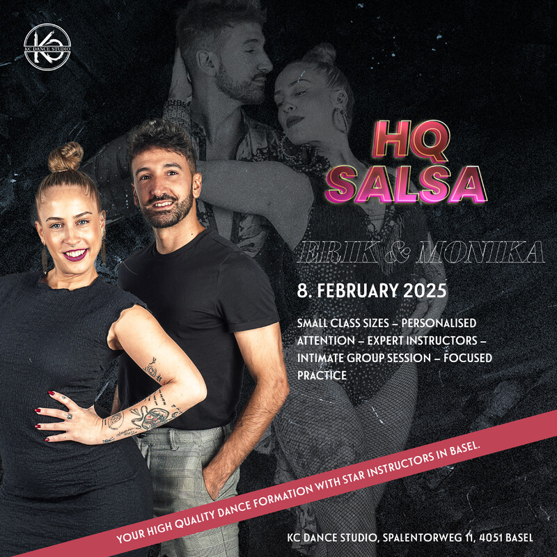 We’re excited to welcome Erik and Monika from Spain for a series of incredible workshops and inspiring dances. Don’t miss the HQ Salsa event at KCDS! Take advantage of our unique small group workshops designed to elevate your Salsa skills to new heights. Join us for an unforgettable experience! Take the chance and spend 6,5 hours with internationally renowned dancers! Schedule: Friday, February 7, 2025: 19:00 – 21:00: Afrorumba Bodymovement Saturday, February 8, 2025: 14:30 – 16:30: Musicality for Social Dancing 16:45 – 18:15: Social Dance Combination 18:15 – 19:15: Focused Practice To get the most out of the workshops, we recommend having a basic understanding of Salsa foundations and steps. Our exceptional HQ Salsa and Bachata events are designed for dancers of all levels, aiming to elevate your foundational skills, connections, and overall dancing experience. Learn from world-class instructors who will inspire you every step of the way. https://kcdancestudio.com/event/hq-salsa/