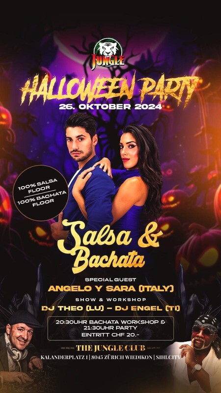 HALLOWEEN PARTY SALSA & BACHATA * BACHATA SHOW * ​* ANGELO Y SARA (ITALY) * * BACHATA WORKSHOP * * 2 DANCE FLOORS * * DJ THEO * * DJ ENGEL * Timetable 20:30 Bachata Workshop 21:30 Party 24:00 Show Party | Workshop | Show | Animation 20 CHF Eintritt Check all our events here: www.thejungleclub.ch www.thejungleclub.ch www.thejungleclub.ch