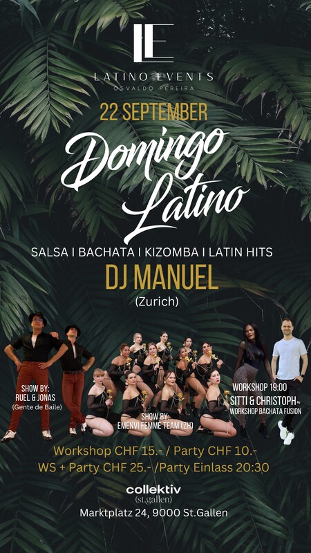 ‼️‼️Domingo Latino‼️‼️ Special Workshop Bachata Fusion by: Sitti&Stephan (zh) Show by: Jonas & Ruel Gente de Baile (SG) Show by: Emenvin Femme Team (ZH) 🎊🎊💃🏼🕺🎊🎊 #ABAILAR #SALSEROSSILLAMANYOVENGO🎵🎶 #ESOOOO💃🏼🕺 Jeden Sonntag findet jetzt neue in Colletivee am Marktplaz 24 St. Gallen der Tanz-Event DOMINGO LATINO statt. Wie immer erwarten euch Osvaldo und seine resident DJs. Kommt vorbei und tanzt in einem tollen Ambiente zu sensationellen Musik. 💃🏽🕺🏻 #ABAILAR #bachata #latinamericandance #salsacubana #salsabachata #kizombaaddict #latino #salsadancing #socialdance #DomingoLatino #fiestalatina # #sundayfunday