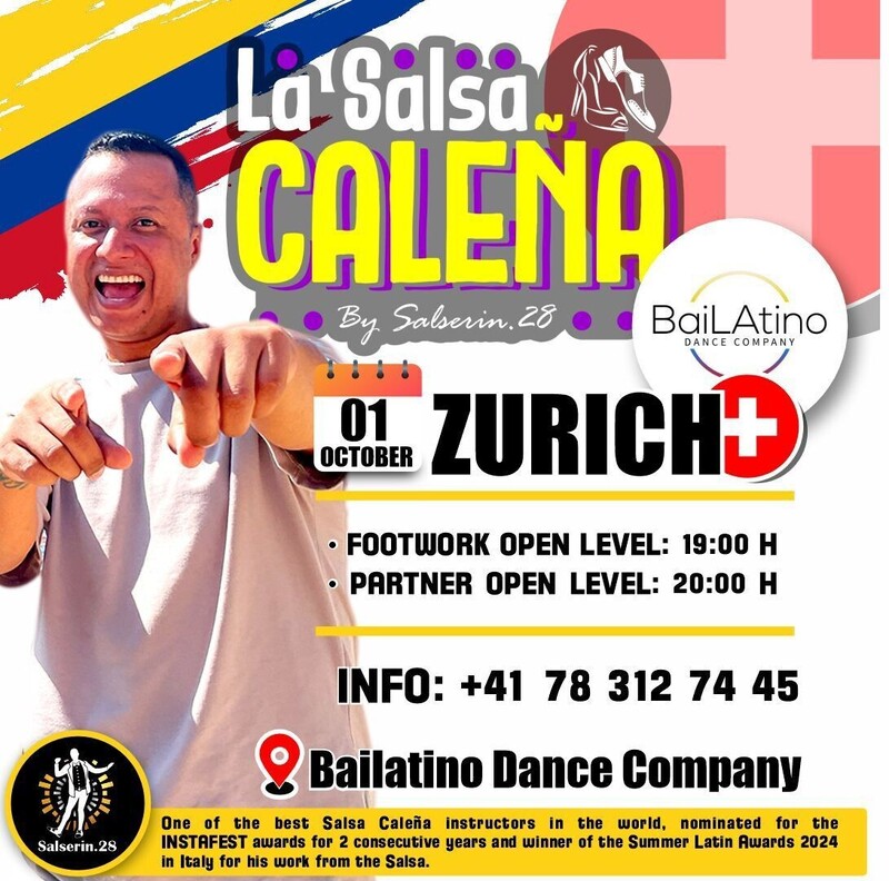 Enjoy an exclusive event with one of the best Salsa Caleña instructors in the world, nominated for the INSTAFEST awards for 2 consecutive years and winner of the Summer Latin Awards 2024! 19:00 Footwork (Open Level) 20:00 Partnerwork (Open Level) The price is 33 CHF for one class or 60 CHF for both https://www.instagram.com/bailatino_dance/