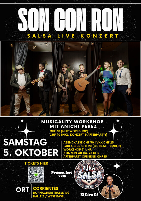 SON CON RON ist eine junge Gruppe von Musikern, welche am 1. July 2013 in Freiburg gegründet wurde. Als Vorband von renommierten Gruppen wie „Soneros de Verdad“ begeistern sie ihr Publikum mit einer Mischung selbstkomponierter Lieder und alten kubanischen Son(g)s. Mittlerweile werden die Lieder von ihrem ersten Album auf der Tanzfläche der grössten Parties uns Salsa-Kongresse in ganz Europa gespielt und sind von Tänzern und Tänzerinnen sehr beliebt. Uns erwartet als Eröffnung der Veranstaltung einen MUSICALITY-WORKSHOP mit niemand Geringerem als ANICHI PÉREZ. Dabei erklärt er die wichtigsten Instrumente und wie man dazu tanzen darf Wir freuen uns bereits! Für die Pre- und Afterparty sorgt WILL EL OTRO DJ für die besten Sounds. Er wird uns die ganze Nacht non stop zum Tanzen bringen. Adresse: Corrientes Dornacherstrasse 192 4153 Basel PREISE ABENDKASSE Konzert: CHF 30 Workshop: CHF 40 (inkl. Konzert) https://www.facebook.com/events/479133811700523