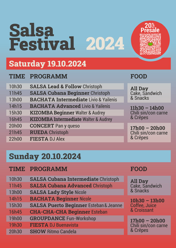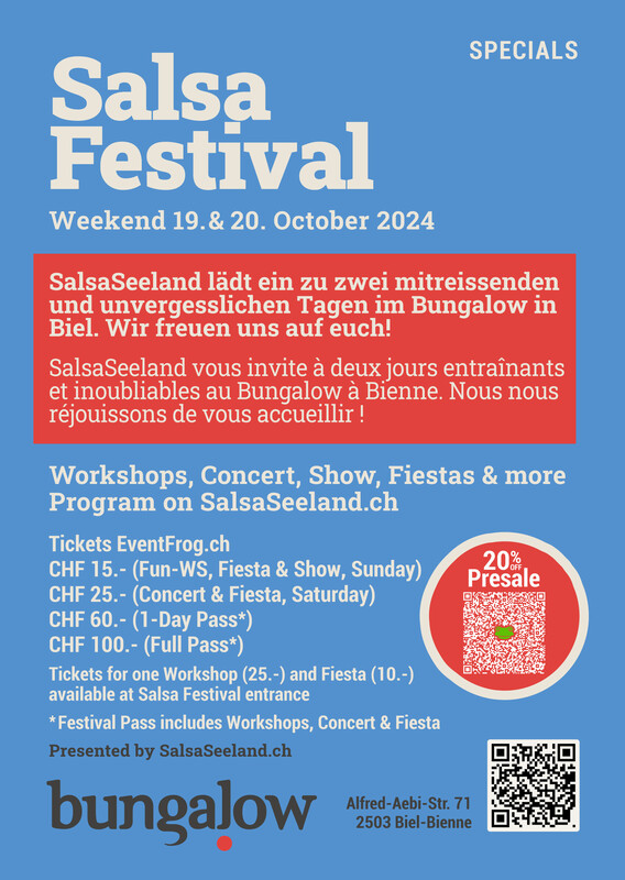 Am 19. und 20. Oktober wird es heiss: Das Salsa Festival ist zurück! Nach dem unglaublichen Erfolg des Jubiläumswochenendes feiern wir erneut die Rhythmen von Salsa, Bachata und Kizomba – egal ob Anfänger, Fortgeschrittener oder einfach nur Liebhaber der Kultur, hier bist du genau richtig! Dich erwarten inspirierende Workshops, mitreissende Konzerte und köstliches latein- und afroamerikanisches Essen. Lass dich von der einzigartigen Atmosphäre und der puren Lebensfreude anstecken – komm vorbei und tanz, feier und geniesse mit uns zwei unvergessliche Tage! Programm Salsa Festival Bienne 2024 SATURDAY 19. OCT 2024 10:30 SALSA Lead & Follow Christoph 11:45 SALSA Cubana Beginner Christoph 13:00 BACHATA Intermediate Livio & Yailenis 14:15 BACHATA Advanced Livio & Yailenis 15:30 KIZOMBA Beginner Walter & Audrey 16:45 KIZOMBA Intermediate Walter & Audrey 20:00 CONCERT Pan y Queso 21:45 RUEDA Christoph  22:00 FIESTA DJ Alex SUNDAY 20. OCT 2024 10:30 SALSA Cubana Intermediate Christoph 11:45 SALSA Cubana Advanced Christoph 13:00 SALSA Lady Style Nicole 14:15 BACHATA Beginner Nicole 15:30 SALSA Puerto Beginner Esteban & Jeanne 16:45 CHA-CHA-CHA Beginner Esteban 19:00 GROUPDANCE Fun-Workshop 19:30 FIESTA DJ Buenavista 20:30 SHOW Ritmo Candela Ort: Bungalow (Eingang Cosmos, 1. Stock), Alfred-Aebi-Strasse 71, 2503 Biel/Bienne http://www.eventfrog.ch/salsafestival