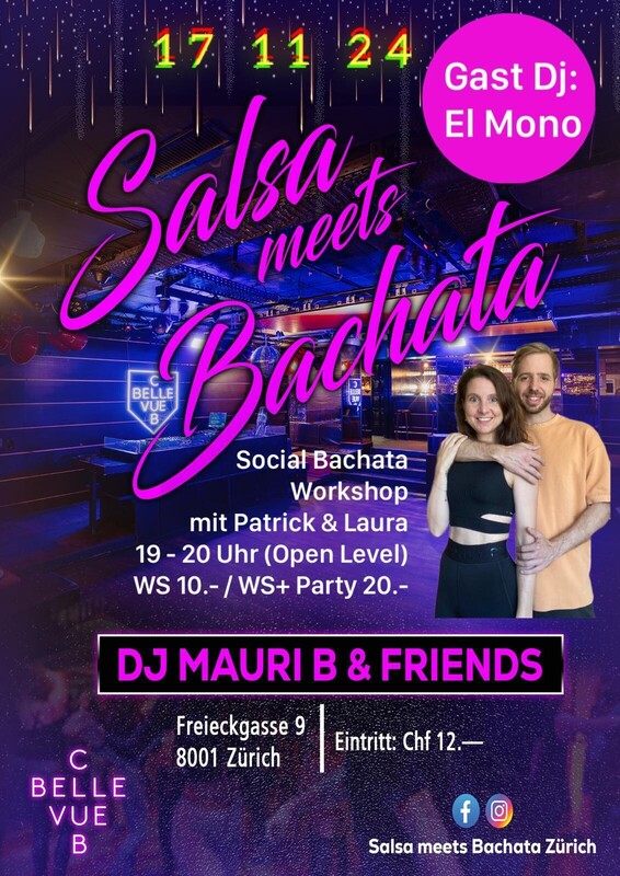 „Salsa meets Bachata“ Es wird heiss wenn diese zwei Rhythmen aufeinander treffen. Ein Abend vollgepackt mit dem besten, angesagtesten Sound dieser zwei Stile - da kann niemand mehr ruhig sitzen bleiben. Salsa und Bachata - all styles Gast: Dj El Mono Bachata Workshop mit Patrick & Laura Start: 19 Uhr CHF 10.-- Party Start: 20 Uhr CHF 12.-- Workshop und Party: CHF 20.- Dj Mauri & friends fb & insta: Salsa meets Bachata Zürich https://www.facebook.com/profile.php?id=100057608822669