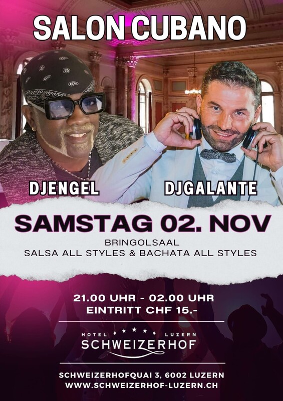 Samstag 2. November 2024 SALON CUBANO Herzlich Willkommen im Legendäre "SALON CUBANO " des 5-Sterne-Hotels Schweizerhof Luzern. BRINGOLFSAAL Salsa All Styles & Bachata All Styles > DJ GALANTE & DJ ENGEL < 21:00 Uhr bis 02:00 Uhr Eintritt CHF 15.- (NUR BARGELD) SUPPORT BY: - Tanzschule Salsabrosa Luzern - Tanzschule Salsa y Mas Luzern - Tanzschule WannDance Luzern - Tanzschule Bachata Flow Luzern - Tanzschule Salsa Emotion Luzern --------------------------------------------------------- BRINGOLFSAAL (216 m2) 1887 erbaut vom «Hofarchitekten» Arnold Bringolf-Hauser, eignet sich der prächtige Bringolfsaal für verschiedenste Veranstaltungen. Der Saal liegt Tür an Tür mit unseren beiden Restaurants Galerie und Pavillon sowie mit dem Zeugheersaal, Wintergarten und Goldroom. Im Bringolfsaal alleine finden 220 Leute Platz. ------------------------------------------------------------------ DAS 5 STERNE HOTEL SCHWEIZERHOF LUZERN liegt direkt am Vierwaldstättersee und in unmittelbarer Nähe zum Stadtzentrum von Luzern. ------------------------------------------------------------------ HOTEL SCHWEIZERHOF LUZERN Schweizerhofquai 3, 6002 Luzern www.schweizerhof-luzern.ch Viele Parkplätze Möglichkeiten in der Nähe: www.parking-luzern.ch https://fb.me/e/aDs5pD1mU
