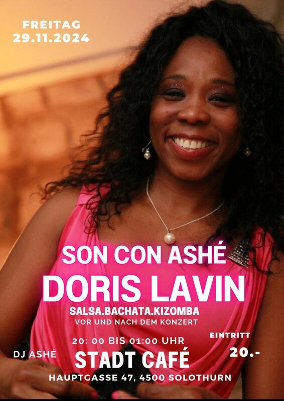 Wir laden Sie ein, zu tanzen und gute kubanische Musik zu genießen. Doris Lavin: Kubanische Sängerin mit einem breiten musikalischen Repertoire. Son . Salsa . Timba . Guaracha . Merengue . ab 22:30 Uhr Live-Konzert mit Doris Lavin ab 20:00 Uhr Salsa Party vor und nach dem Konzert mit Dj Ashé. STADT CAFÉ Hauptgasse 47,4500 Solothurn
